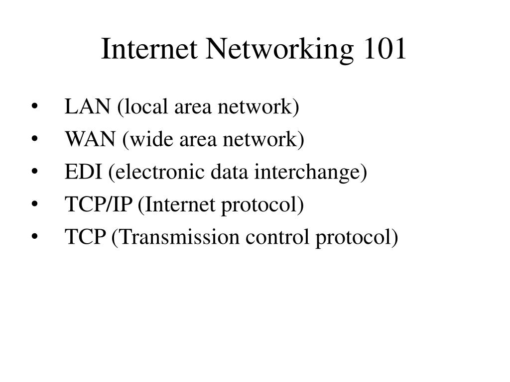 Internet Networking 101 • LAN (local area network) • WAN (wide area network) • EDI (electronic data interchange) • TCP/IP (Internet protocol) • TCP (Transmission control protocol)