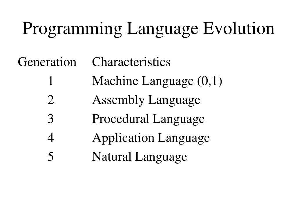 Programming Language Evolution Generation Characteristics 1 Machine Language (0,1) 2 Assembly Language 3 Procedural Language 4 Application Language 5 Natural Language