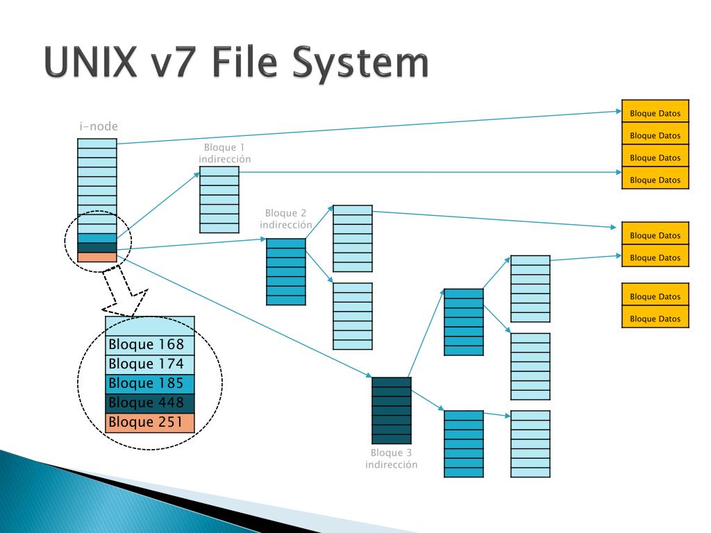 UNIX v7 FileSystem i-node Bloque 1 indirección Bloque 2 indirección Bloque 3 indirección