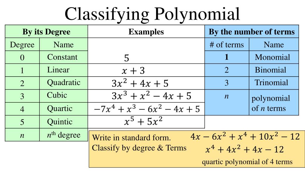 Classifying Polynomial Constant Monomial Linear Binomial Quadratic Trinomial Cubic polynomial of n terms Quartic Quintic nthdegree Write in standard form. Classify by degree & Terms quartic polynomial of 4 terms