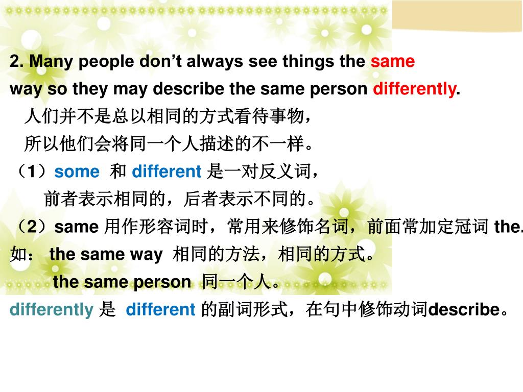 2. Many people don’t always see things the same way so they may describe the same person differently. 人们并不是总以相同的方式看待事物, 所以他们会将同一个人描述的不一样。 (1)some 和 different 是一对反义词, 前者表示相同的,后者表示不同的。 (2)same 用作形容词时,常用来修饰名词,前面常加定冠词 the. 如: the same way 相同的方法,相同的方式。 the same person 同一个人。 differently是 different 的副词形式,在句中修饰动词describe。