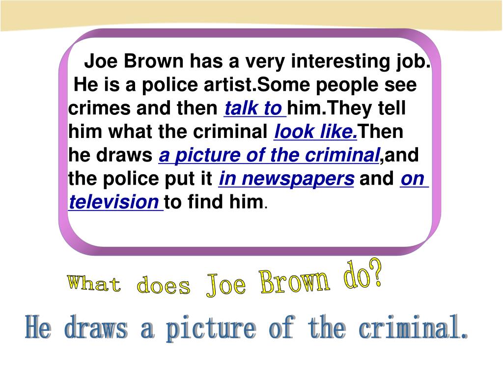 Joe Brown has a very interesting job. He is a police artist.Some people see crimes and then talk to him.They tell him what the criminal look like.Then he draws a picture of the criminal,and the police put it in newspapers and on television to find him. What does Joe Brown do? He draws a picture of the criminal.