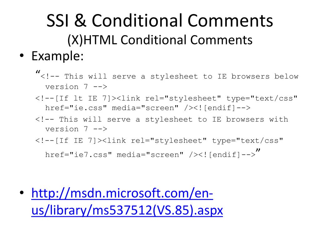 SSI & Conditional Comments (X)HTML Conditional Comments • Example: “<!-- This will serve a stylesheet to IE browsers below version 7 --> <!--[If lt IE 7]><link rel="stylesheet" type="text/css" href="ie.css" media="screen" /><![endif]--> <!-- This will serve a stylesheet to IE browsers with version 7 --> <!--[If IE 7]><link rel="stylesheet" type="text/css" href="ie7.css" media="screen" /><![endif]-->” • http://msdn.microsoft.com/en-us/library/ms537512(VS.85).aspx