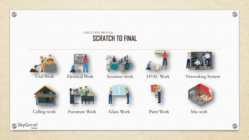 EXECUTION PROCESS SCRATCH TO FINAL Securities work HVAC Work Networking System Civil Work Electrical Work Celling work Mix work Furniture Work Glass Work Paint Work
