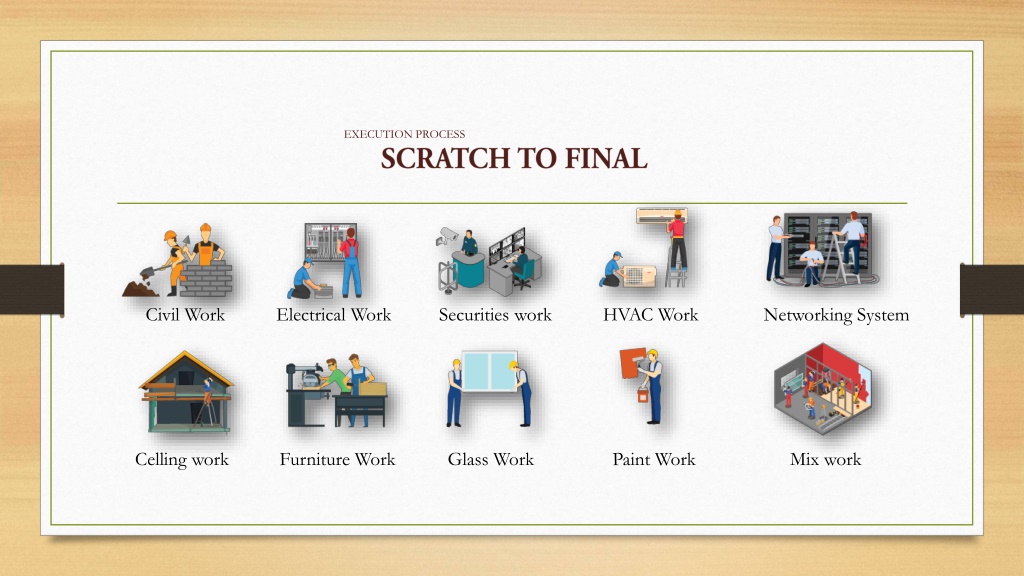 EXECUTION PROCESSSCRATCH TO FINAL Civil Work Electrical Work Securities work HVAC Work Networking System Celling work Furniture Work Glass Work Paint Work Mix work