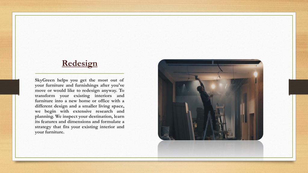 Redesign SkyGreen helps you get the most out of your furniture and furnishings after you've move or would like to redesign anyway. To transform your existing interiors and furniture into a new home or office with a different design and a smaller living space, we begin with extensive research and planning. We inspect your destination, learn its features and dimensions and formulate a strategy that fits your existing interior and your furniture.