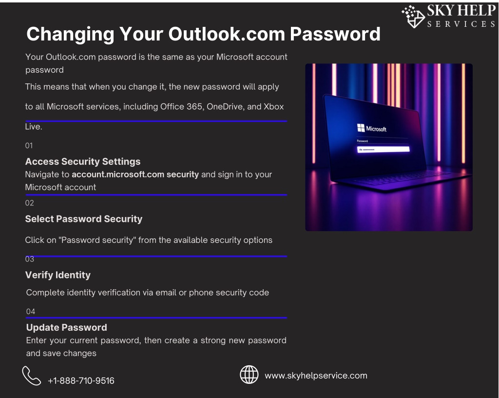 Changing Your Outlook.com Password Your Outlook.com password is the same as your Microsoft account password This means that when you change it, the new password will apply to all Microsoft services, including Office 365, OneDrive, and Xbox Live. 01 Access Security Settings Navigate to account.microsoft.com security and sign in to your Microsoft account 02 Select Password Security Click on "Password security" from the available security options 03 Verify Identity Complete identity verification via email or phone security code 04 Update Password Enter your current password, then create a strong new password and save changes www.skyhelpservice.com +1-888-710-9516