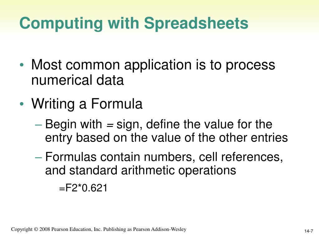 Computing with Spreadsheets • Most common application is to process numerical data • Writing a Formula • Begin with = sign, define the value for the entry based on the value of the other entries • Formulas contain numbers, cell references, and standard arithmetic operations =F2*0.621