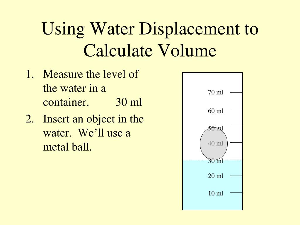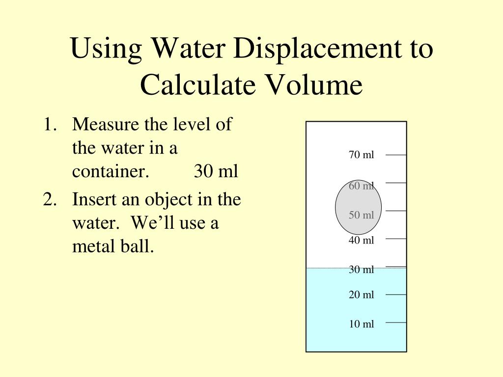 Using Water Displacement to Calculate Volume The metal ball has a volume of 9 ml! 70 ml 60 ml 50 ml 40 ml 30 ml 20 ml 10 ml