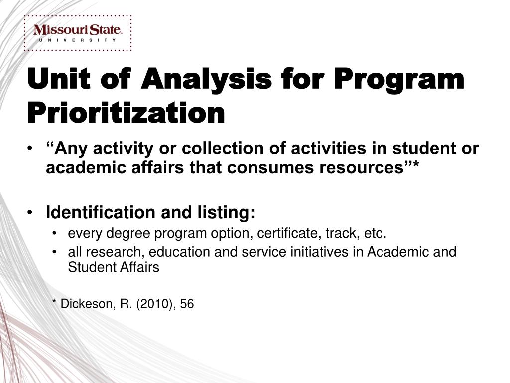 Unit of Analysis for Program Prioritization • “Any activity or collection of activities in student or academic affairs that consumes resources”* • Identification and listing: • every degree program option, certificate, track, etc. • all research, education and service initiatives in Academic and Student Affairs * Dickeson, R. (2010), 56