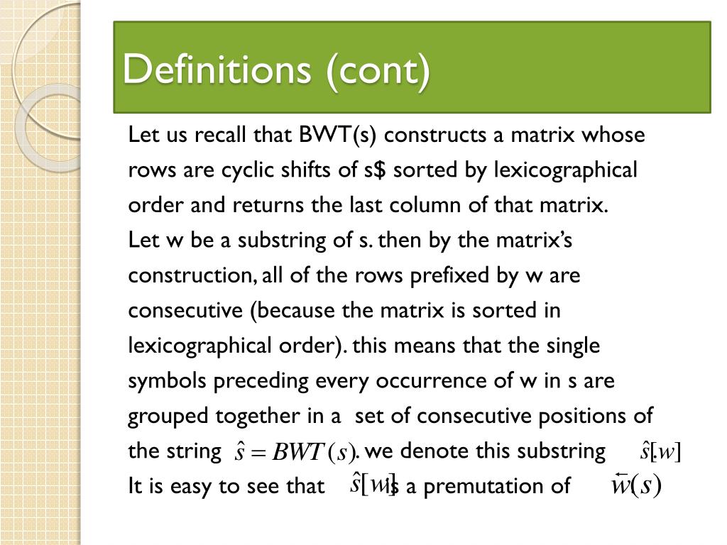 Definitions (cont) Let us recall that BWT(s) constructs a matrix whose rows are cyclic shifts of s$ sorted by lexicographical order and returns the last column of that matrix. Let w be a substring of s. then by the matrix’s construction, all of the rows prefixed by w are consecutive (because the matrix is sorted in lexicographical order). this means that the single symbols preceding every occurrence of w in s are grouped together in a set of consecutive positions of the string . we denote this substring . It is easy to see that is a premutation of .