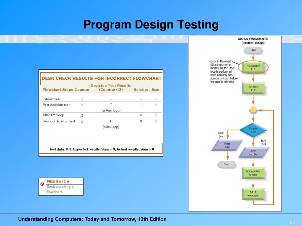 Program design: The program specifications are expanded into a complete design of the new program Good program design is extremely important Program design tools Structure charts: Depict the overall organization of a program Shown in Figure 13-1 Flowcharts: Show graphically step-by-step how a computer program will process data Use special symbols and relational operators Can be drawn by hand or with flowcharting software The Program Development Life Cycle (PDLC)