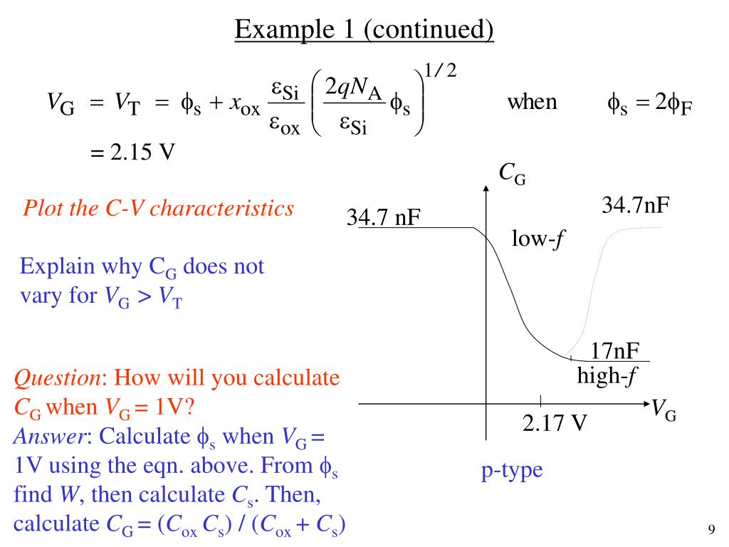 CG 34.7nF low-f 17nF high-f VG 2.17 V p-type Example 1 (continued) = 2.15 V Plot the C-V characteristics 34.7 nF Explain why CG does not vary for VG > VT Question: How will you calculate CG when VG = 1V? Answer: Calculate s when VG = 1V using the eqn. above. From s find W, then calculate Cs. Then, calculate CG = (Cox Cs) / (Cox + Cs)