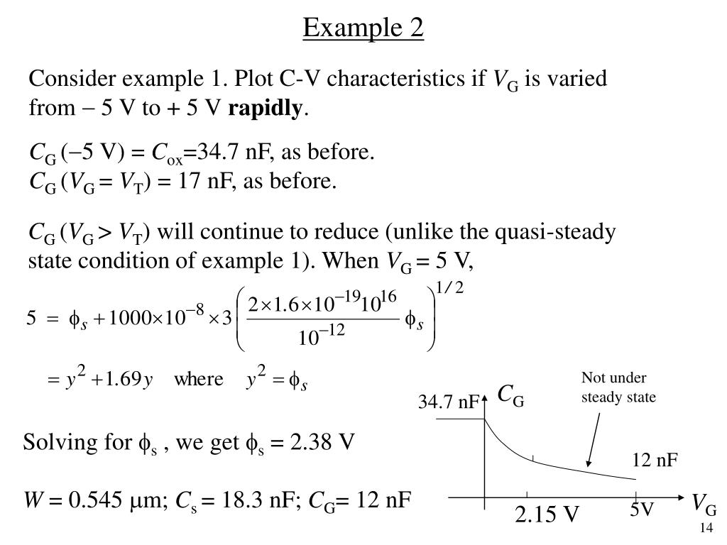 Not under steady state CG 34.7 nF 12 nF VG 5V 2.15 V Example 2 Consider example 1. Plot C-V characteristics if VG is varied from 5 V to + 5 V rapidly. CG (5 V) = Cox=34.7 nF, as before. CG (VG = VT) = 17 nF, as before. CG (VG > VT) will continue to reduce (unlike the quasi-steady state condition of example 1). When VG = 5 V, Solving for s , we get s = 2.38 V W = 0.545 m; Cs = 18.3 nF; CG= 12 nF