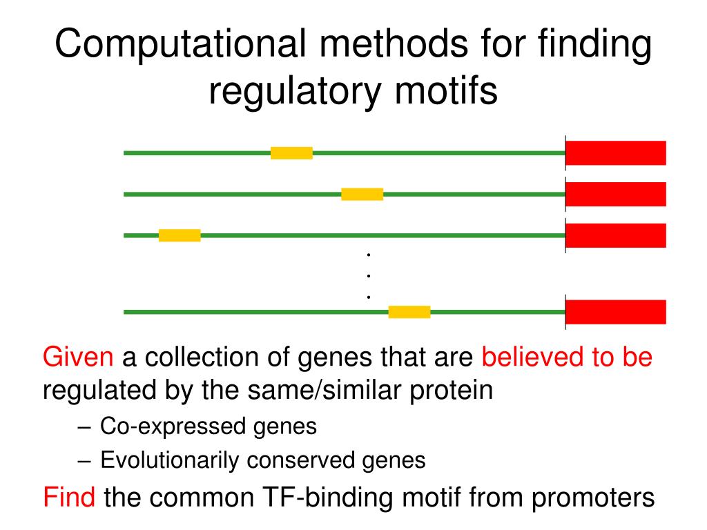 Computational methods for finding regulatory motifs Given a collection of genes that are believed to be regulated by the same/similar protein • Co-expressed genes • Evolutionarily conserved genes Find the common TF-binding motif from promoters . . .