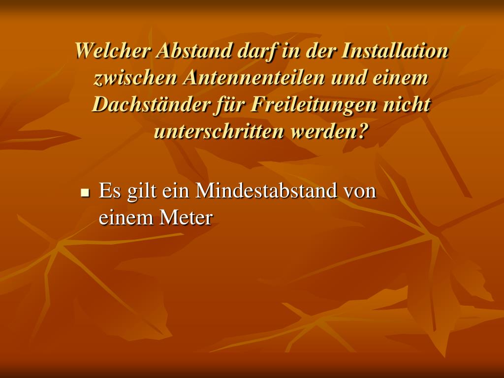 Welcher Abstand darf in der Installation zwischen Antennenteilen und einem Dachständer für Freileitungen nicht unterschritten werden? Es gilt ein Mindestabstand von einem Meter