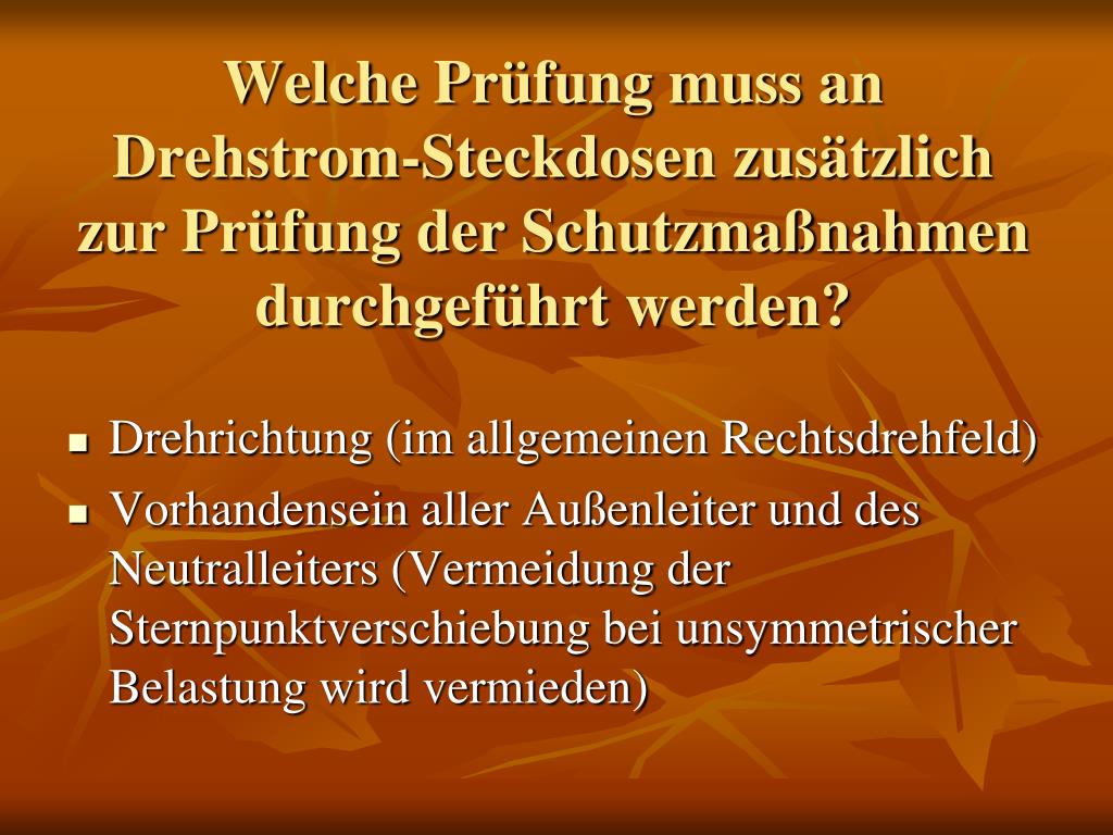 Welche Prüfung muss an Drehstrom-Steckdosen zusätzlich zur Prüfung der Schutzmaßnahmen durchgeführt werden? • Drehrichtung (im allgemeinen Rechtsdrehfeld) • Vorhandensein aller Außenleiter und des Neutralleiters (Vermeidung der Sternpunktverschiebung bei unsymmetrischer Belastung wird vermieden)