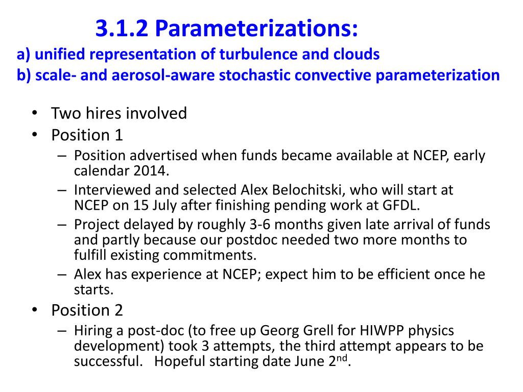 3.1.2 Parameterizations: a) unified representation of turbulence and cloudsb) scale- and aerosol-aware stochastic convective parameterization • Two hires involved • Position 1 • Position advertised when funds became available at NCEP, early calendar 2014. • Interviewed and selected Alex Belochitski, who will start at NCEP on 15 July after finishing pending work at GFDL. • Project delayed by roughly 3-6 months given late arrival of funds and partly because our postdoc needed two more months to fulfill existing commitments. • Alex has experience at NCEP; expect him to be efficient once he starts. • Position 2 • Hiring a post-doc (to free up Georg Grell for HIWPP physics development) took 3 attempts, the third attempt appears to be successful. Hopeful starting date June 2nd.