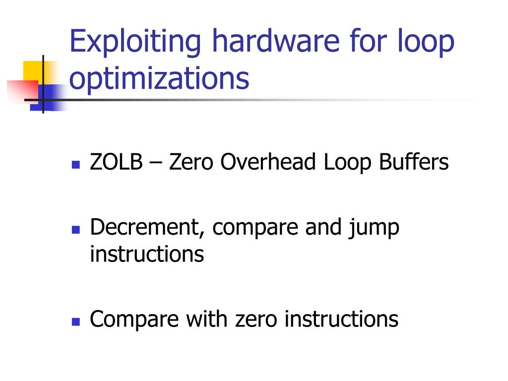 Exploiting hardware for loop optimizations • ZOLB – Zero Overhead Loop Buffers • Decrement, compare and jump instructions • Compare with zero instructions