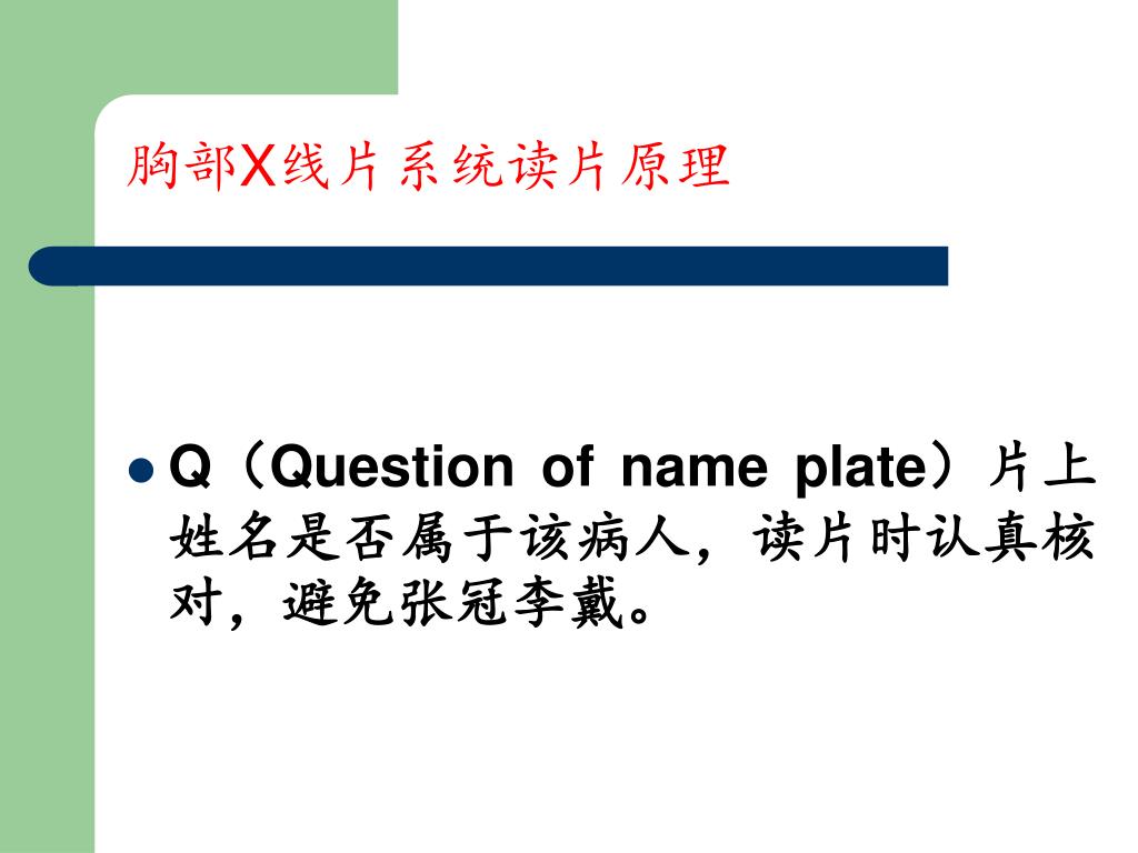 胸部X线片系统读片原理 • Q(Question of name plate)片上姓名是否属于该病人,读片时认真核对,避免张冠李戴。