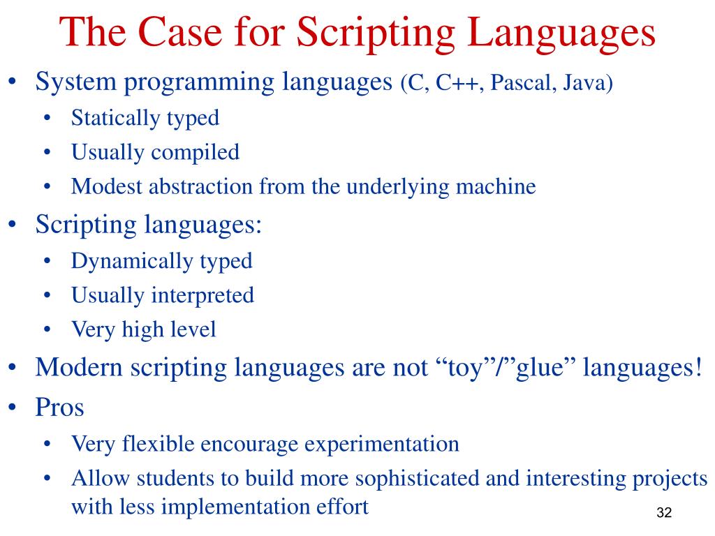 Criteria for a First Language • Requirements from a first programming course: • Learning how to program • Problem solving, design • Implications for Programming Language Choice • Simple syntax and semantics (simple problems should be solved simply) • Hands on: high level and flexible languages allow designs to be expressed with minimal overhead encourages experimentation • Supports modern approaches to design and abstraction (e.g., OOP) • Widely available (not for “teaching only”, used in the “real world”) 31