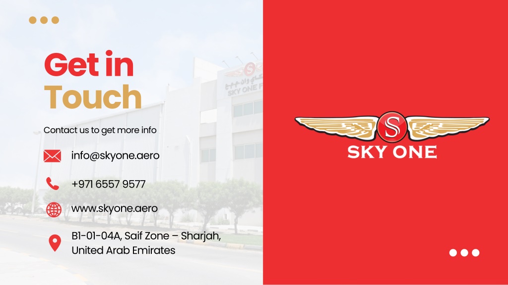 Get in Touch Contact us to get more info info@skyone.aero +971 6557 9577 www.skyone.aero B1-01-04A, Saif Zone – Sharjah, United Arab Emirates