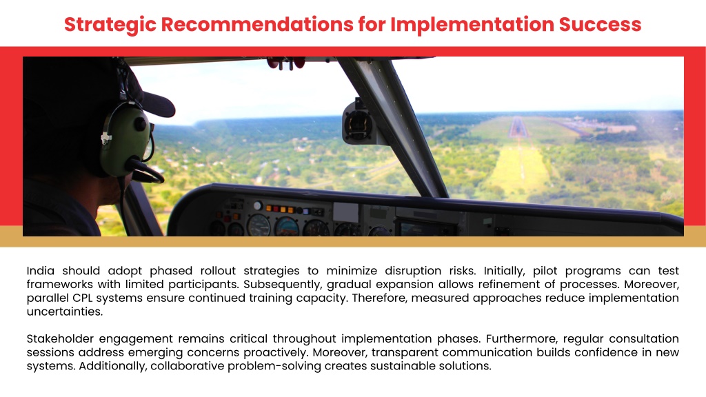 Strategic Recommendations for Implementation Success India should adopt phased rollout strategies to minimize disruption risks. Initially, pilot programs can test frameworks with limited participants. Subsequently, gradual expansion allows refinement of processes. Moreover, parallel CPL systems ensure continued training capacity. Therefore, measured approaches reduce implementation uncertainties. Stakeholder engagement remains critical throughout implementation phases. Furthermore, regular consultation sessions address emerging concerns proactively. Moreover, transparent communication builds confidence in new systems. Additionally, collaborative problem-solving creates sustainable solutions.