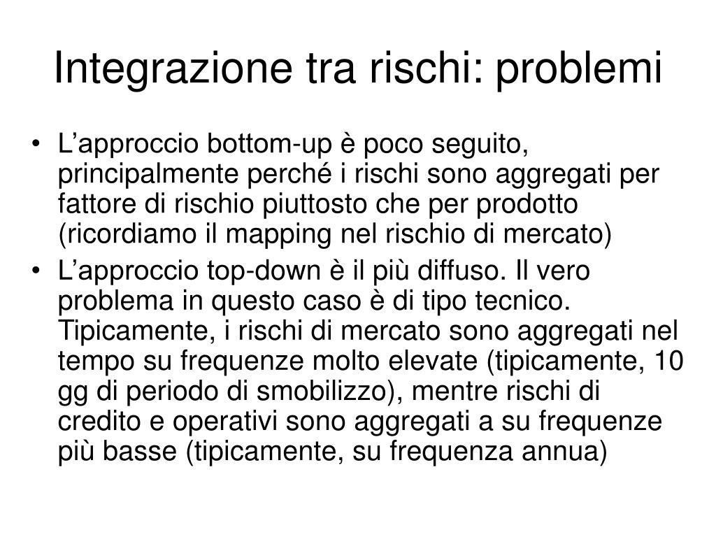 Integrazione tra rischi: problemi • L’approccio bottom-up è poco seguito, principalmente perché i rischi sono aggregati per fattore di rischio piuttosto che per prodotto (ricordiamo il mapping nel rischio di mercato) • L’approccio top-down è il più diffuso. Il vero problema in questo caso è di tipo tecnico. Tipicamente, i rischi di mercato sono aggregati nel tempo su frequenze molto elevate (tipicamente, 10 gg di periodo di smobilizzo), mentre rischi di credito e operativi sono aggregati a su frequenze più basse (tipicamente, su frequenza annua)