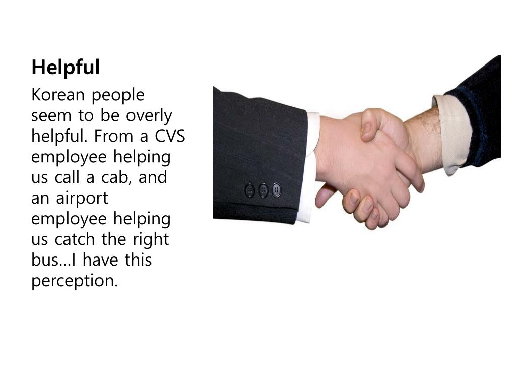 Helpful Korean people seem to be overly helpful. From a CVS employee helping us call a cab, and an airport employee helping us catch the right bus…I have this perception.