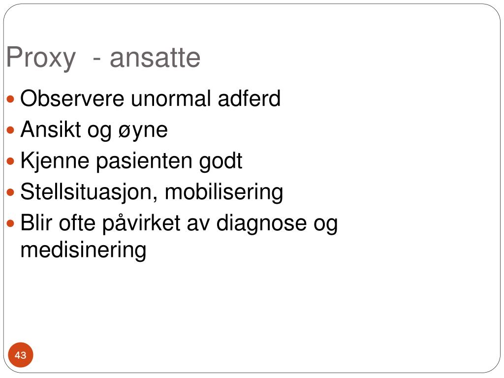 Proxy ansatte • Nygaard (2005) for kommunikative pasienter er det moderat/godt samsvar mellom pasienters og pleiers vurdering i sykehjem Sjøstrøm (1995) sykepleiere, leger sammenlignet med pasientmålinger i en postoperativ setting: • 41 % samsvar • 57 % underestimering • 2 % overestimering