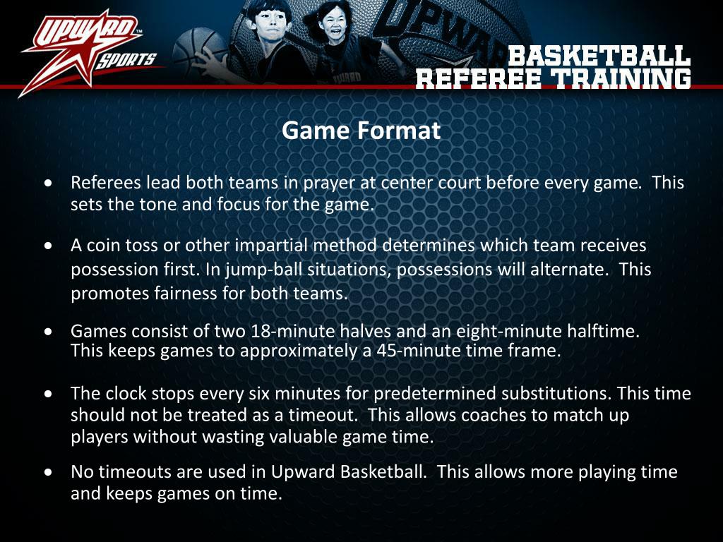Game Format • Referees lead both teams in prayer at center court before every game. This sets the tone and focus for the game. • A coin toss or other impartial method determines which team receives possession first. In jump-ball situations, possessions will alternate. This promotes fairness for both teams. • Games consist of two 18-minute halves and an eight-minute halftime. This keeps games to approximately a 45-minute time frame. • The clock stops every six minutes for predetermined substitutions. This time should not be treated as a timeout. This allows coaches to match up players without wasting valuable game time. • No timeouts are used in Upward Basketball. This allows more playing time and keeps games on time.