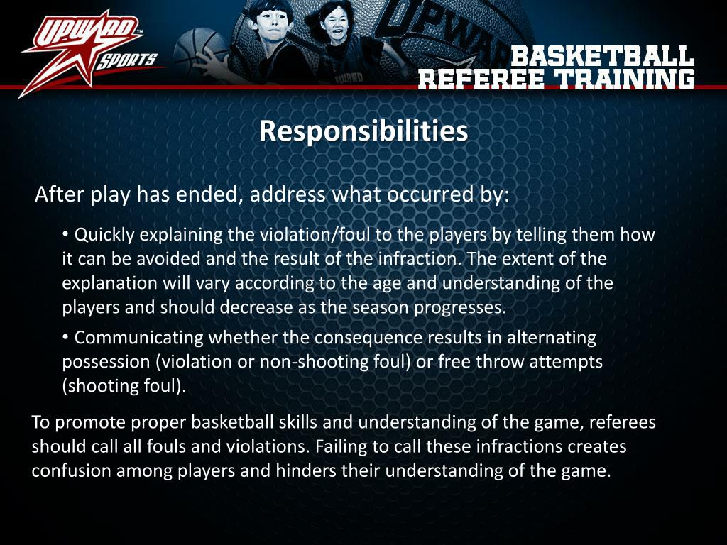 Responsibilities After play has ended, address what occurred by: • Quickly explaining the violation/foul to the players by telling them how it can be avoided and the result of the infraction. The extent of the explanation will vary according to the age and understanding of the players and should decrease as the season progresses. • Communicating whether the consequence results in alternating possession (violation or non-shooting foul) or free throw attempts (shooting foul). • To promote proper basketball skills and understanding of the game, referees should call all fouls and violations. Failing to call these infractions creates confusion among players and hinders their understanding of the game.