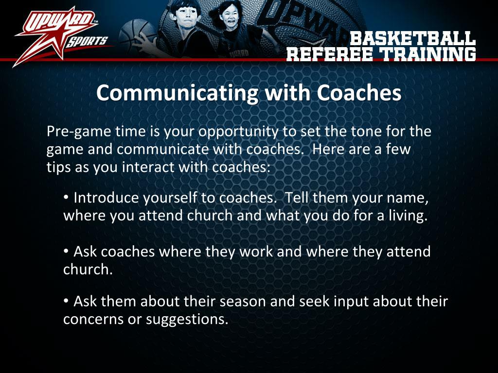 Upward Basketball Referee Training Conference. Communicating with Coaches. Pre-game time is your opportunity to set the tone for the game and communicate with coaches. Here are a few tips as you interact with coaches:.