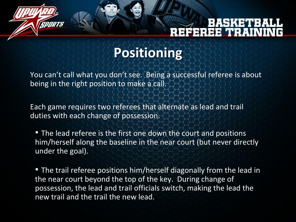 Positioning You can’t call what you don’t see. Being a successful referee is about being in the right position to make a call. • Each game requires two referees that alternate as lead and trail duties with each change of possession. • The lead referee is the first one down the court and positions him/herself along the baseline in the near court (but never directly under the goal). • The trail referee positions him/herself diagonally from the lead in the near court beyond the top of the key. During change of possession, the lead and trail officials switch, making the lead the new trail and the trail the new lead.