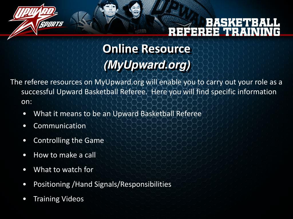 Online Resource (MyUpward.org) The referee resources on MyUpward.org will enable you to carry out your role as a successful Upward Basketball Referee. Here you will find specific information on: • What it means to be an Upward Basketball Referee • Communication • Controlling the Game • How to make a call • What to watch for • Positioning /Hand Signals/Responsibilities • Training Videos