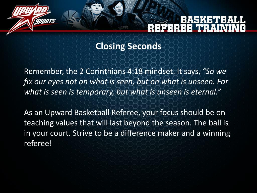 Closing Seconds Remember, the 2 Corinthians 4:18 mindset. It says, “So we fix our eyes not on what is seen, but on what is unseen. For what is seen is temporary, but what is unseen is eternal.” As an Upward Basketball Referee, your focus should be on teaching values that will last beyond the season. The ball is in your court. Strive to be a difference maker and a winning referee!