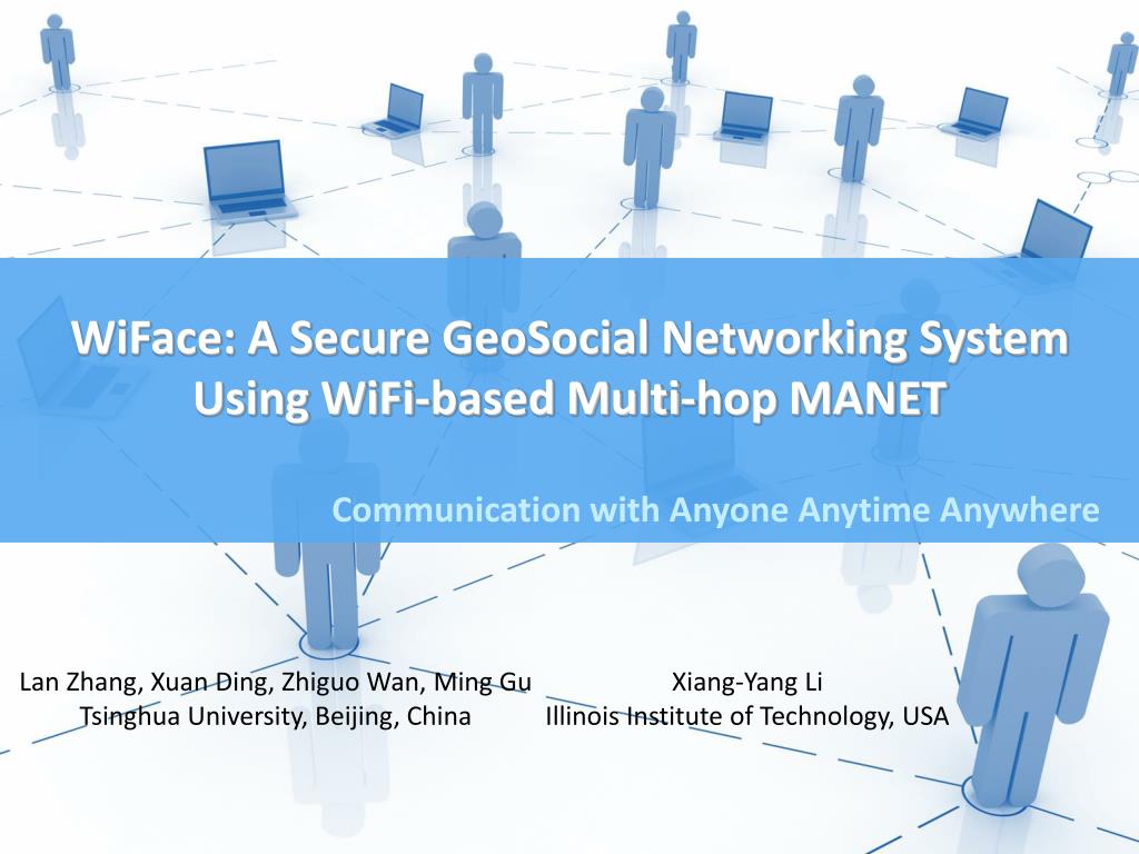 WiFace: A Secure GeoSocial Networking System Using WiFi-based Multi-hop MANET Communication with Anyone Anytime Anywhere Lan Zhang, Xuan Ding, Zhiguo Wan, Ming Gu Tsinghua University, Beijing, China Xiang-Yang Li Illinois Institute of Technology, USA
