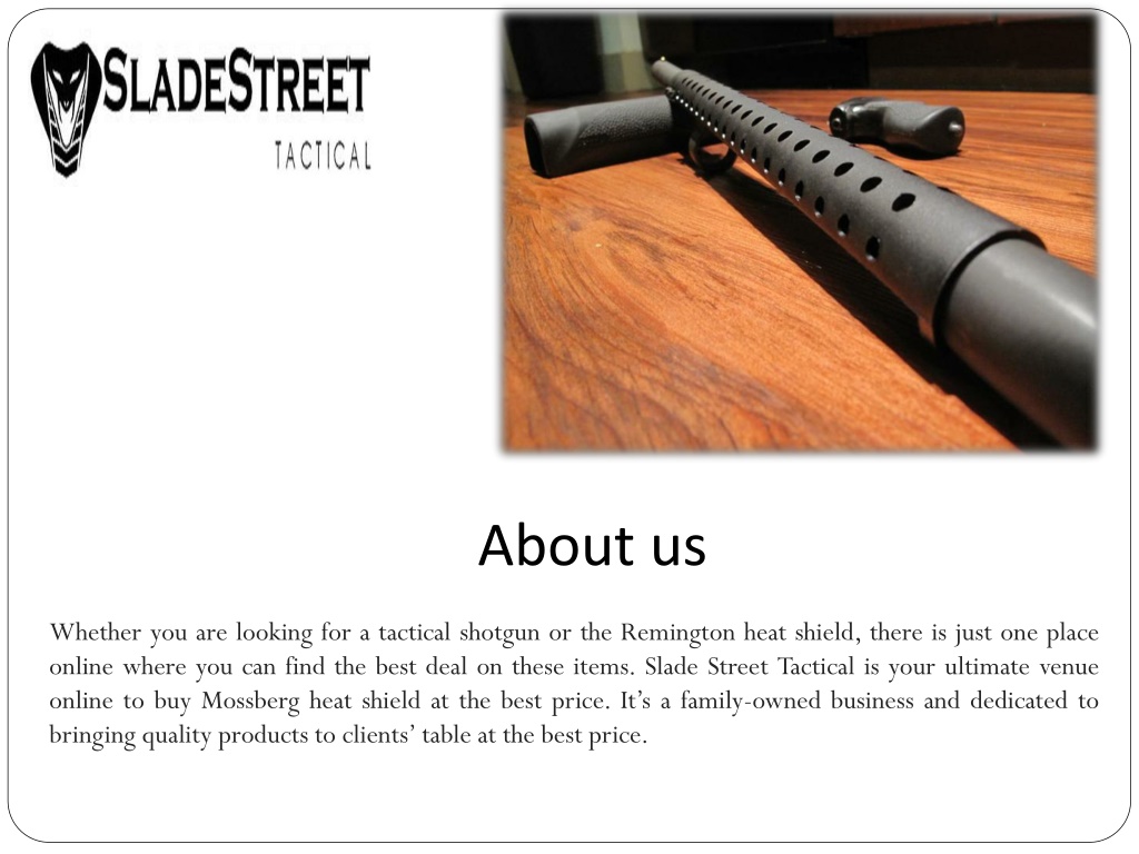 About us Whether you are looking for a tactical shotgun or the Remington heat shield, there is just one place online where you can find the best deal on these items. Slade Street Tactical is your ultimate venue online to buy Mossberg heat shield at the best price. It’s a family-owned business and dedicated to bringing quality products to clients’ table at the best price.