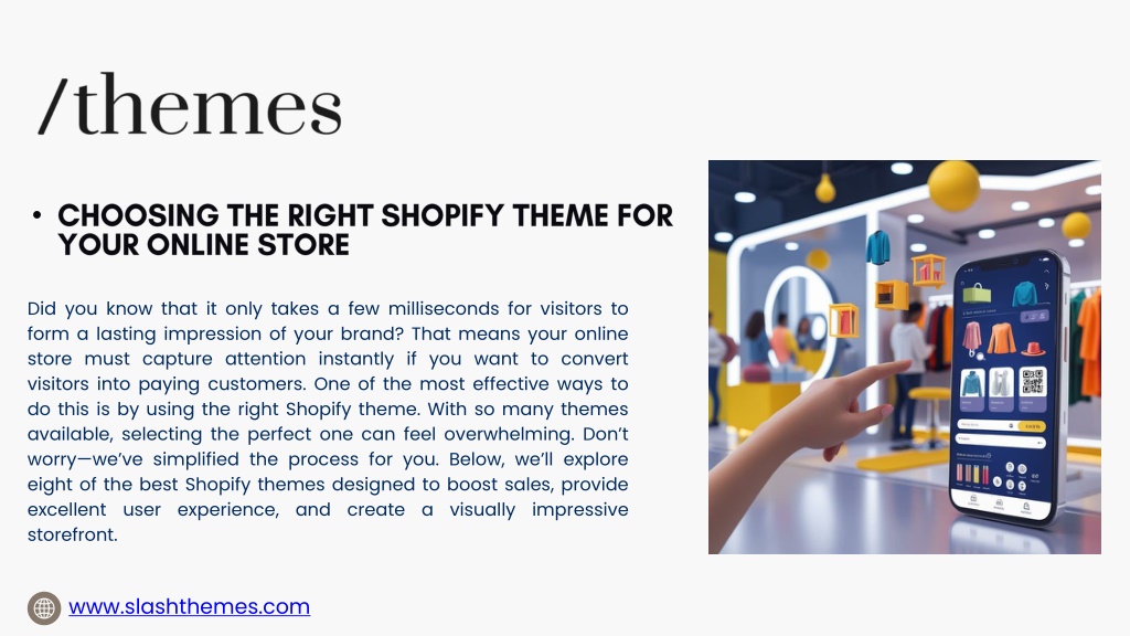 www.slashthemes.com • CHOOSING THE RIGHT SHOPIFY THEME FOR YOUR ONLINE STORE Did you know that it only takes a few milliseconds for visitors to form a lasting impression of your brand? That means your online store must capture attention instantly if you want to convert visitors into paying customers. One of the most effective ways to do this is by using the right Shopify theme. With so many themes available, selecting the perfect one can feel overwhelming. Don’t worry—we’ve simplified the process for you. Below, we’ll explore eight of the best Shopify themes designed to boost sales, provide excellent user experience, and create a visually impressive storefront.