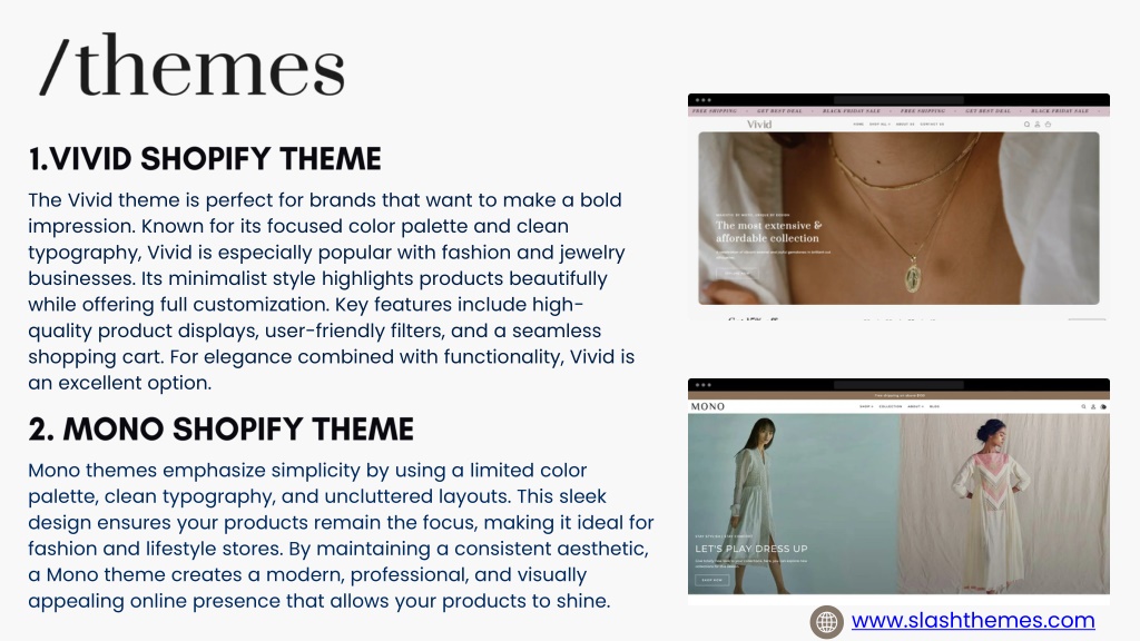 www.slashthemes.com 1.VIVID SHOPIFY THEME The Vivid theme is perfect for brands that want to make a bold impression. Known for its focused color palette and clean typography, Vivid is especially popular with fashion and jewelry businesses. Its minimalist style highlights products beautifully while offering full customization. Key features include high-quality product displays, user-friendly filters, and a seamless shopping cart. For elegance combined with functionality, Vivid is an excellent option. 2. MONO SHOPIFY THEME Mono themes emphasize simplicity by using a limited color palette, clean typography, and uncluttered layouts. This sleek design ensures your products remain the focus, making it ideal for fashion and lifestyle stores. By maintaining a consistent aesthetic, a Mono theme creates a modern, professional, and visually appealing online presence that allows your products to shine.