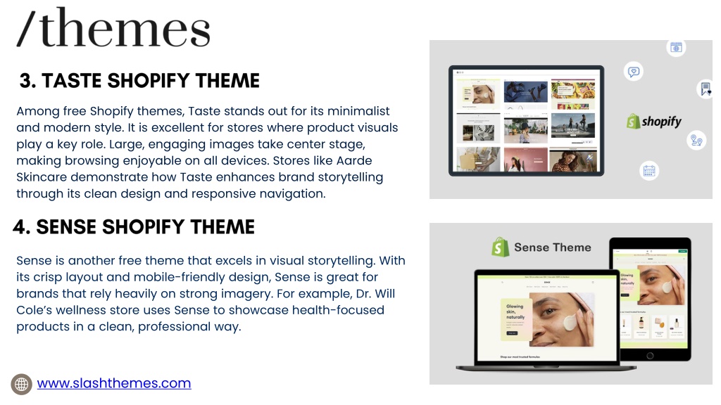 www.slashthemes.com 3. TASTE SHOPIFY THEME Among free Shopify themes, Taste stands out for its minimalist and modern style. It is excellent for stores where product visuals play a key role. Large, engaging images take center stage, making browsing enjoyable on all devices. Stores like Aarde Skincare demonstrate how Taste enhances brand storytelling through its clean design and responsive navigation. 4. SENSE SHOPIFY THEME Sense is another free theme that excels in visual storytelling. With its crisp layout and mobile-friendly design, Sense is great for brands that rely heavily on strong imagery. For example, Dr. Will Cole’s wellness store uses Sense to showcase health-focused products in a clean, professional way.