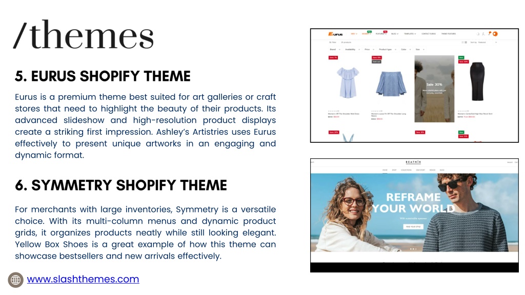 www.slashthemes.com 5. EURUS SHOPIFY THEME Eurus is a premium theme best suited for art galleries or craft stores that need to highlight the beauty of their products. Its advanced slideshow and high-resolution product displays create a striking first impression. Ashley’s Artistries uses Eurus effectively to present unique artworks in an engaging and dynamic format. 6. SYMMETRY SHOPIFY THEME For merchants with large inventories, Symmetry is a versatile choice. With its multi-column menus and dynamic product grids, it organizes products neatly while still looking elegant. Yellow Box Shoes is a great example of how this theme can showcase bestsellers and new arrivals effectively.
