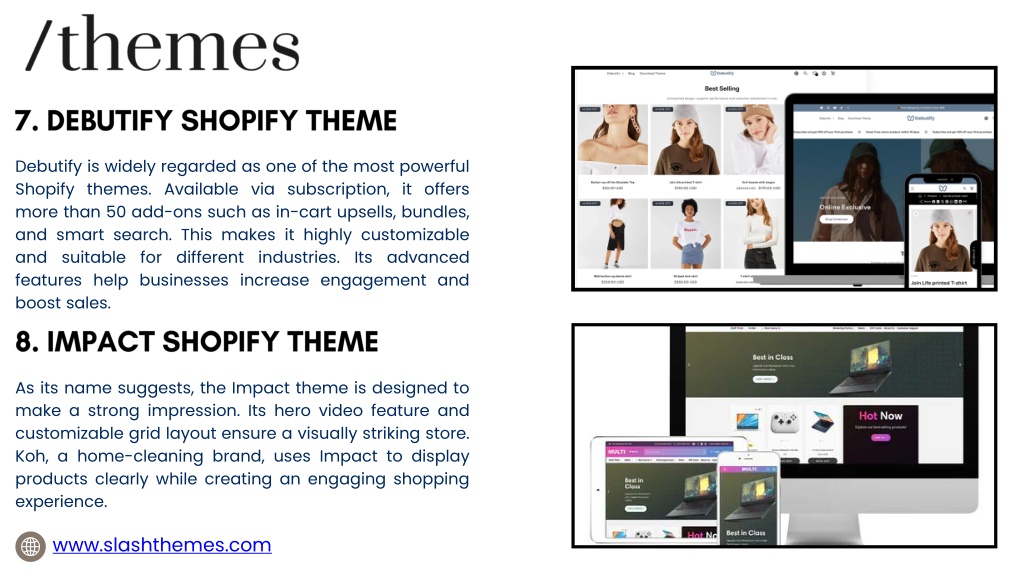 www.slashthemes.com 7. DEBUTIFY SHOPIFY THEME Debutify is widely regarded as one of the most powerful Shopify themes. Available via subscription, it offers more than 50 add-ons such as in-cart upsells, bundles, and smart search. This makes it highly customizable and suitable for different industries. Its advanced features help businesses increase engagement and boost sales. 8. IMPACT SHOPIFY THEME As its name suggests, the Impact theme is designed to make a strong impression. Its hero video feature and customizable grid layout ensure a visually striking store. Koh, a home-cleaning brand, uses Impact to display products clearly while creating an engaging shopping experience.