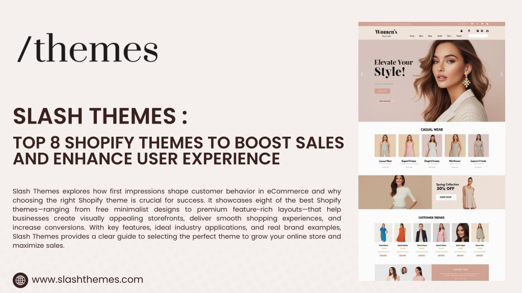 This presentation by Slash Themes explores how first impressions shape customer behavior in eCommerce and why choosing the right Shopify theme is crucial for success. It showcases eight of the best Shopify themesu2014ranging from free minimalist designs to premium feature-rich layoutsu2014that help businesses create visually appealing storefronts, deliver smooth shopping experiences, and increase conversions. With key features, ideal industry applications, and real brand examples, Slash Themes provides a clear guide to selecting the perfect theme to grow your online store and maximize sales.<br>