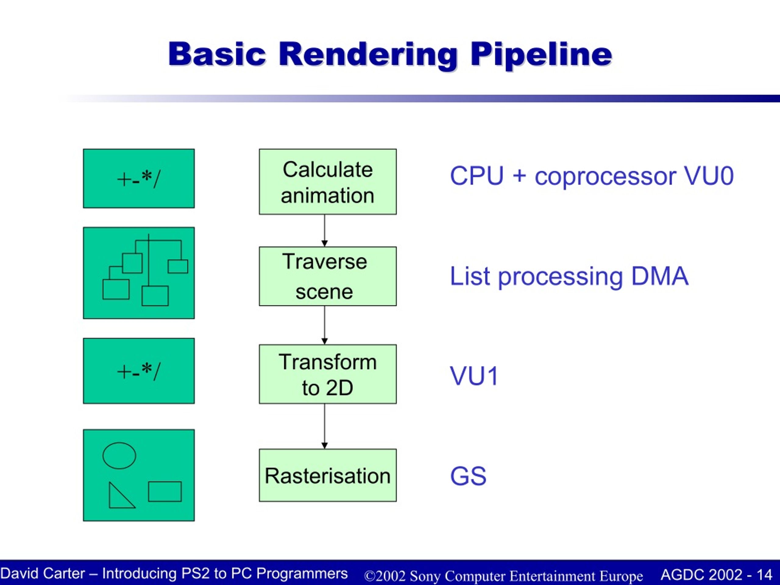 Basic Rendering Pipeline Basic Rendering Pipeline Calculate animation CPU + coprocessor VU0 +-*/ Traverse scene List processing DMA Transform to 2D +-*/ VU1 GS Rasterisation David Carter – Introducing PS2 to PC Programmers AGDC 2002 - 14 ©2002 Sony Computer Entertainment Europe