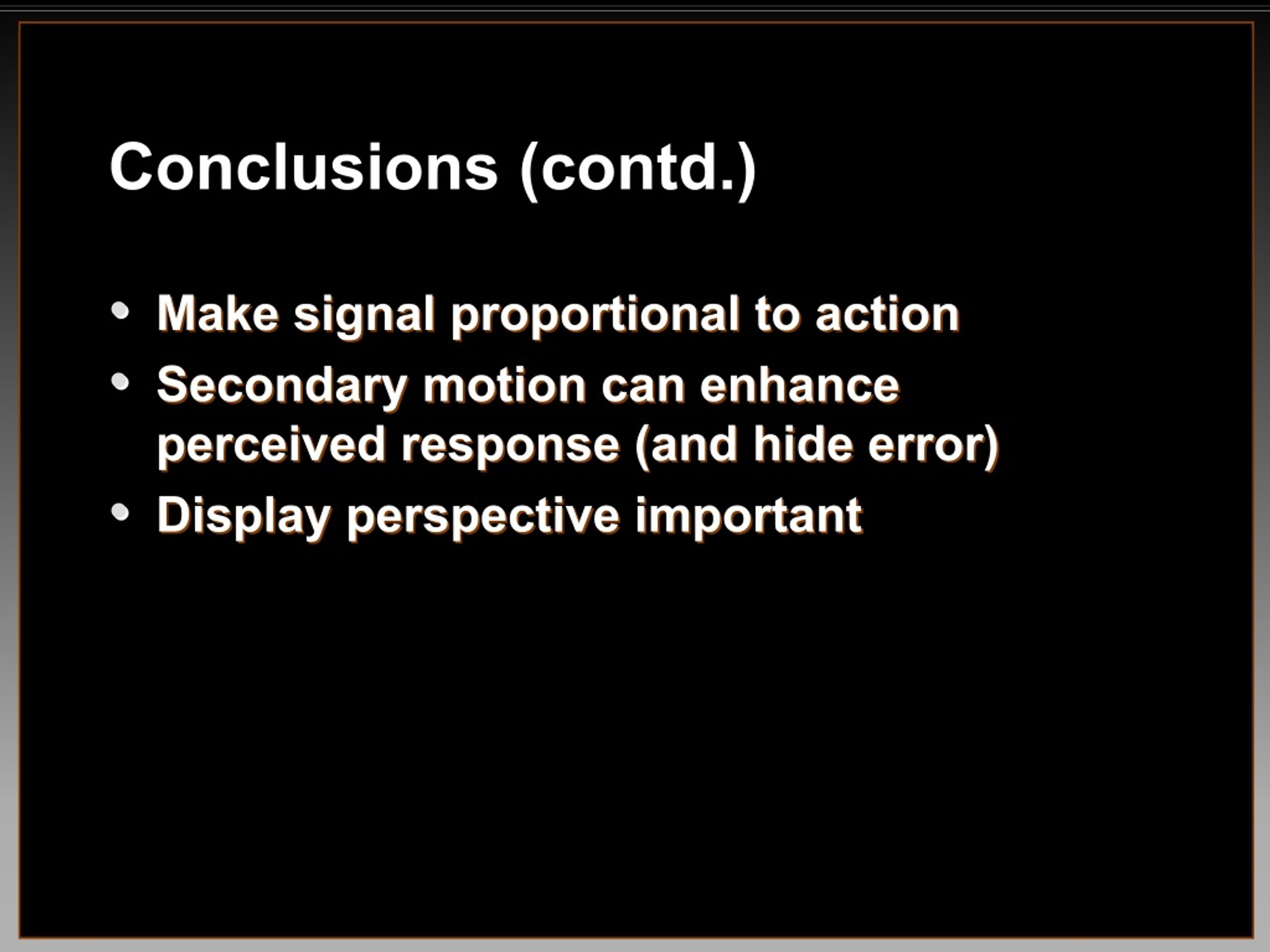 Conclusions (contd.) • • Make signal proportional to action Make signal proportional to action • • Secondary motion can enhance Secondary motion can enhance perceived response (and hide error) perceived response (and hide error) • • Display perspective important Display perspective important