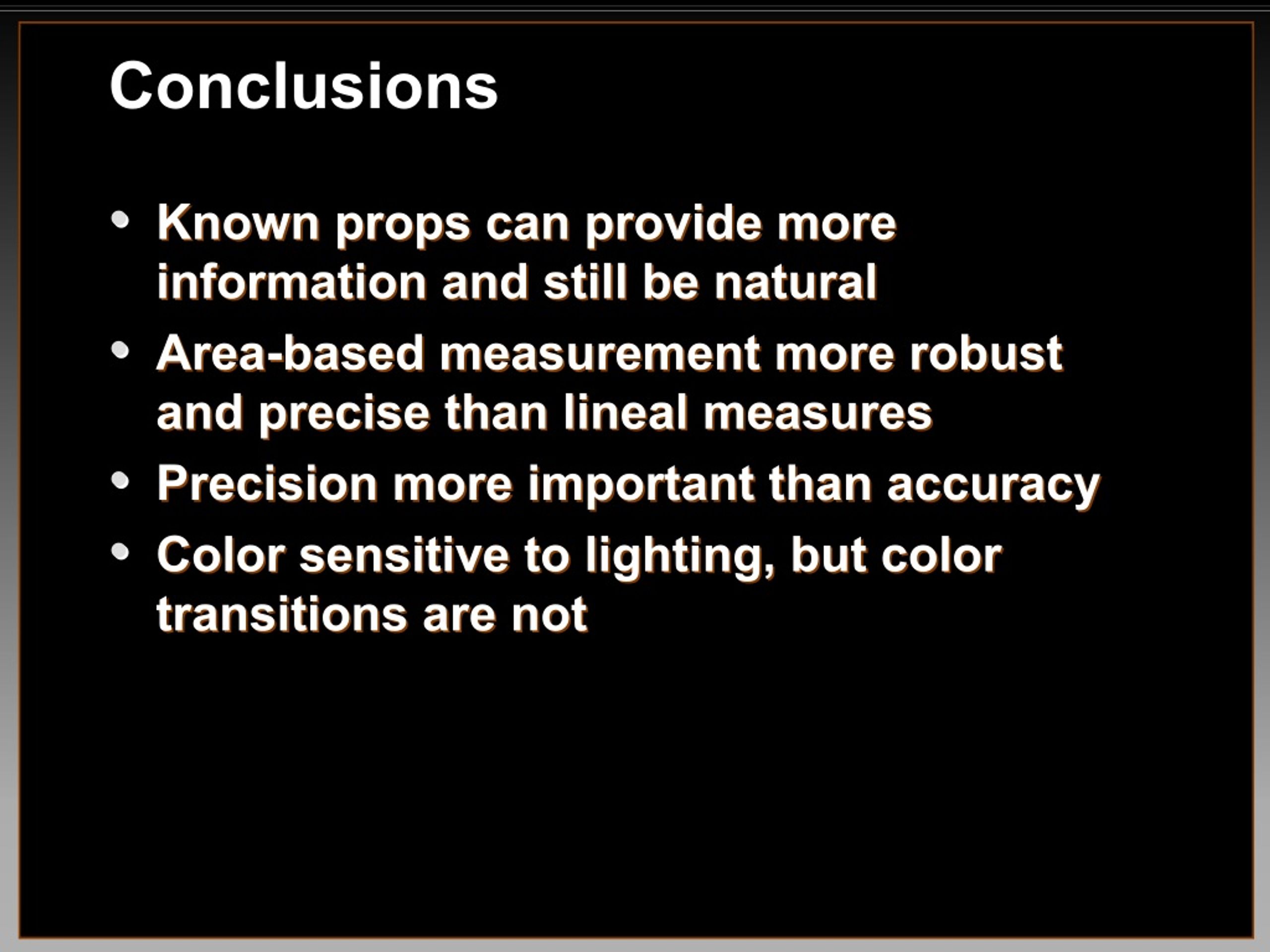 Conclusions • • Known props can provide more Known props can provide more information and still be natural information and still be natural • • Area Area- -based measurement more robust based measurement more robust and precise than lineal measures and precise than lineal measures • • Precision more important than accuracy Precision more important than accuracy • • Color sensitive to lighting, but color Color sensitive to lighting, but color transitions are not transitions are not