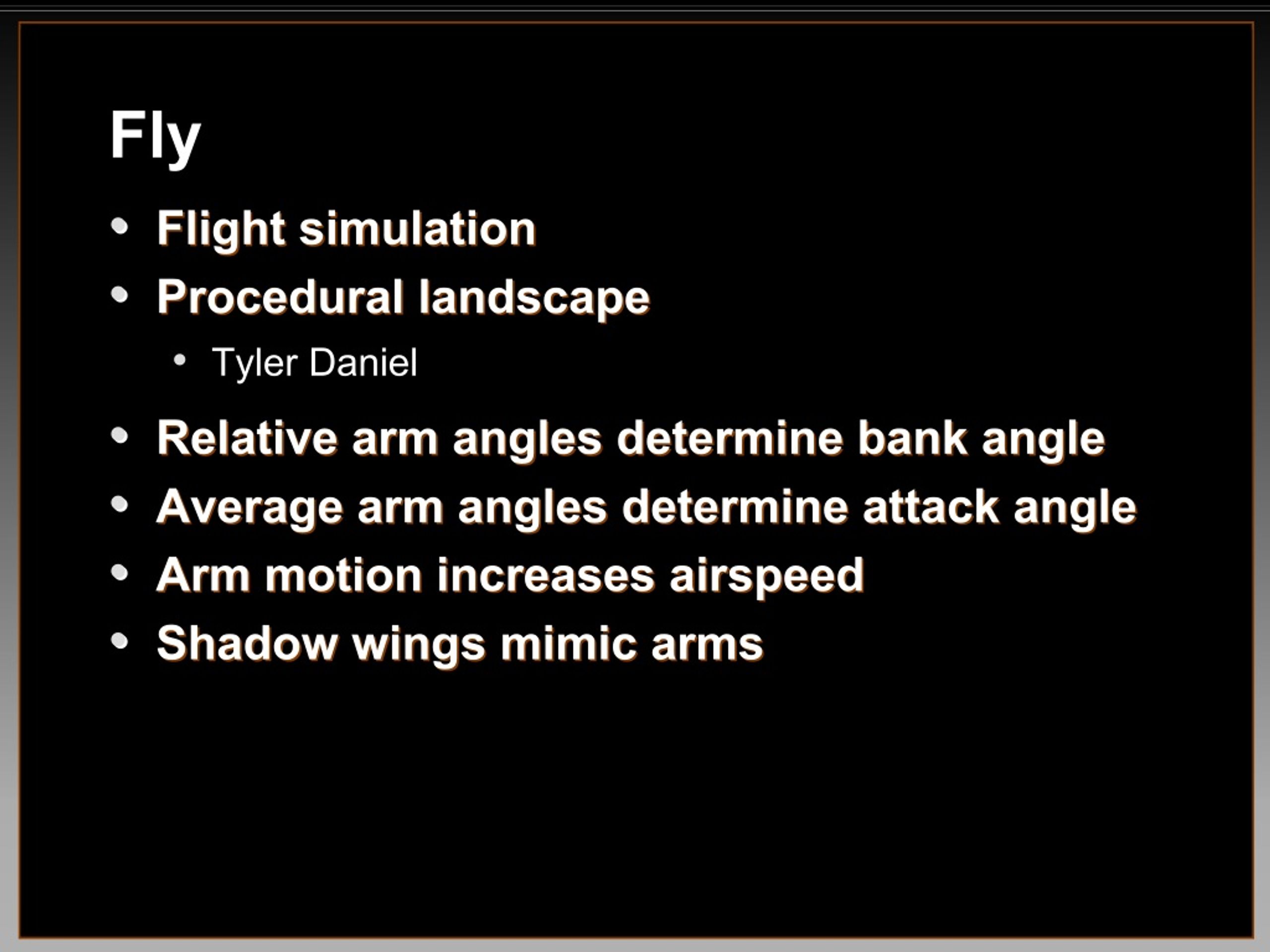 Fly • • Flight simulation Flight simulation • • Procedural landscape Procedural landscape • Tyler Daniel • • Relative arm angles determine bank angle Relative arm angles determine bank angle • • Average arm angles determine attack angle Average arm angles determine attack angle • • Arm motion increases airspeed Arm motion increases airspeed • • Shadow wings mimic arms Shadow wings mimic arms