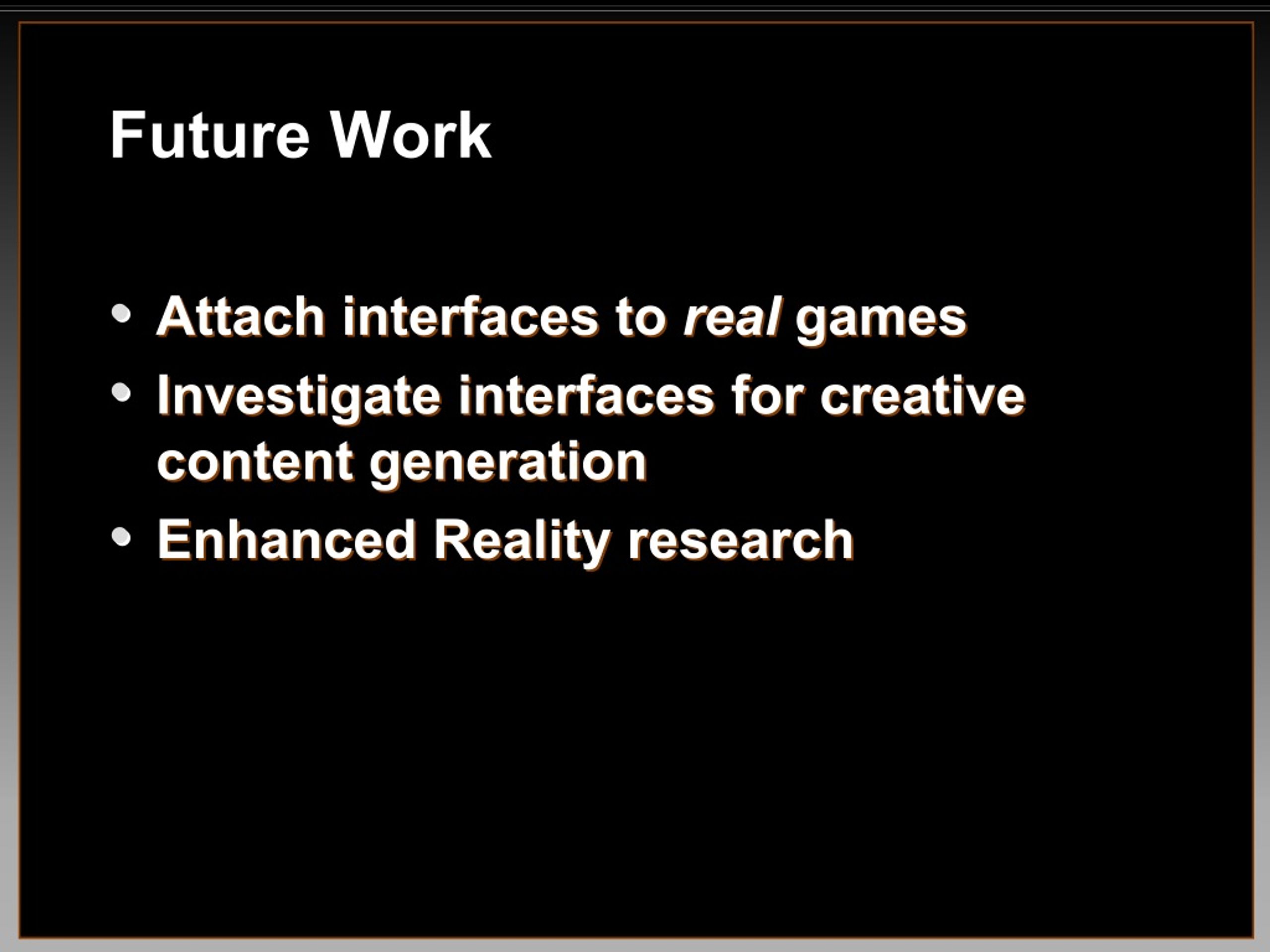 Future Work • • Attach interfaces to Attach interfaces to real • • Investigate interfaces for creative Investigate interfaces for creative content generation content generation • • Enhanced Reality research Enhanced Reality research real games games
