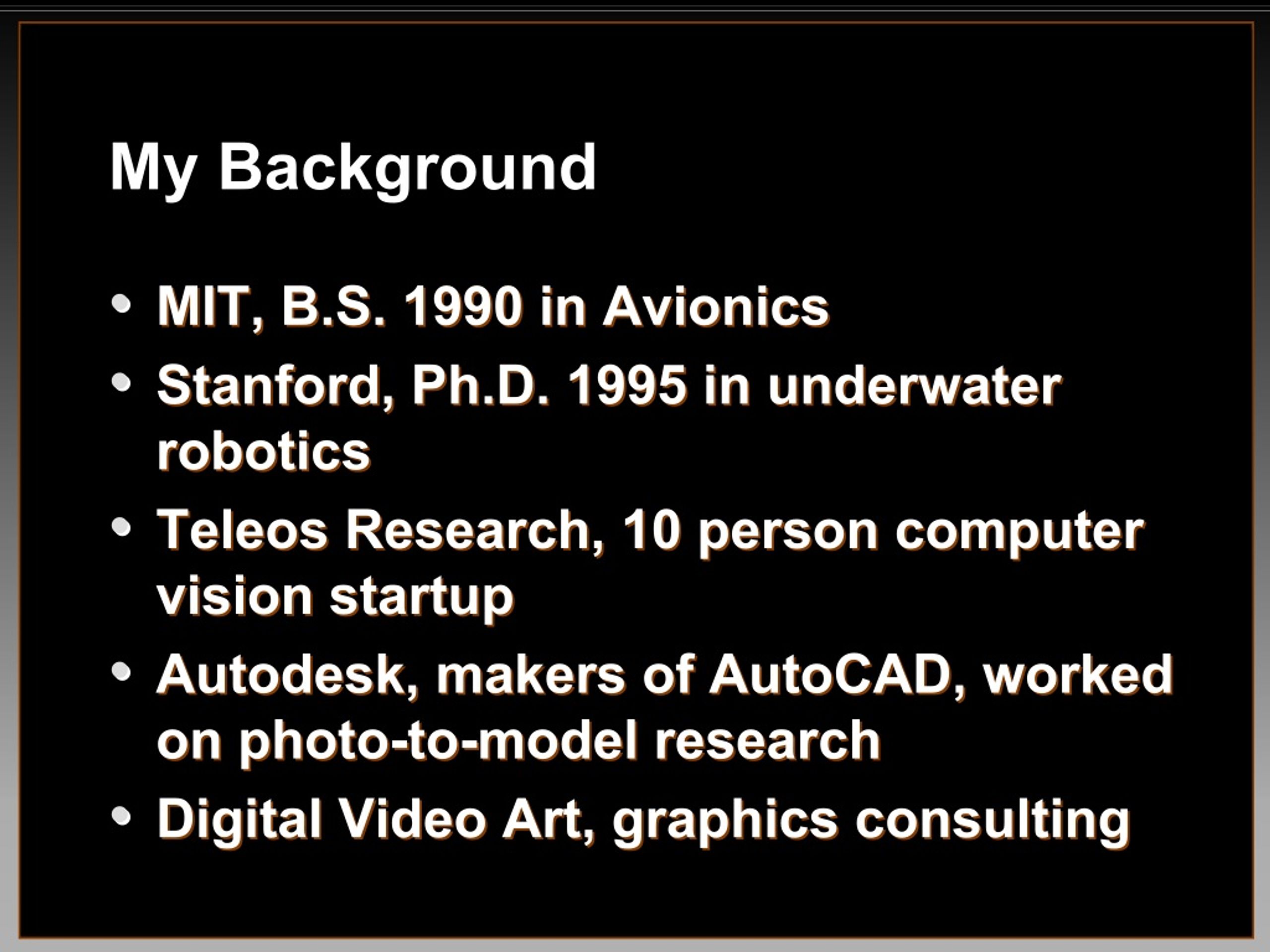 My Background • • MIT, B.S. 1990 in Avionics MIT, B.S. 1990 in Avionics • • Stanford, Stanford, Ph Ph.D. 1995 in underwater .D. 1995 in underwater robotics robotics • • Teleos Teleos Research, 10 person computer Research, 10 person computer vision startup vision startup • • Autodesk Autodesk, makers of AutoCAD, worked , makers of AutoCAD, worked on photo on photo- -to to- -model research model research • • Digital Video Art, graphics consulting Digital Video Art, graphics consulting